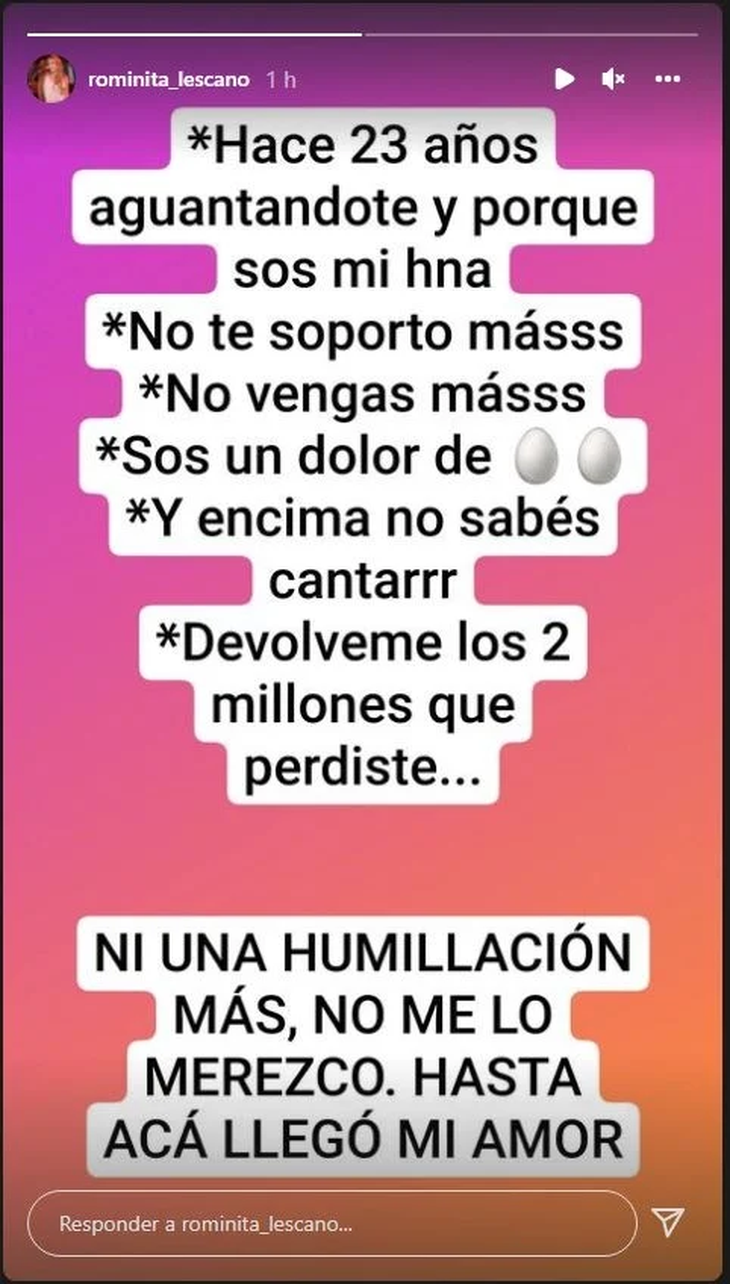 “Hace 23 años vengo aguantándote porque sos mi hermana”, “No te soporto más”, “No vengas más”. “Sos un dolor de hue... Y encima no sabés cantar”, “Devolveme los dos millones que perdiste”, fueron las frases que escuchó y decidió replicar para que sus seguidores descubrieran el destrato de su hermano. "Ni una humillación más, no me lo merezco. Hasta acá llegó mi amor".PUBLICIDAD