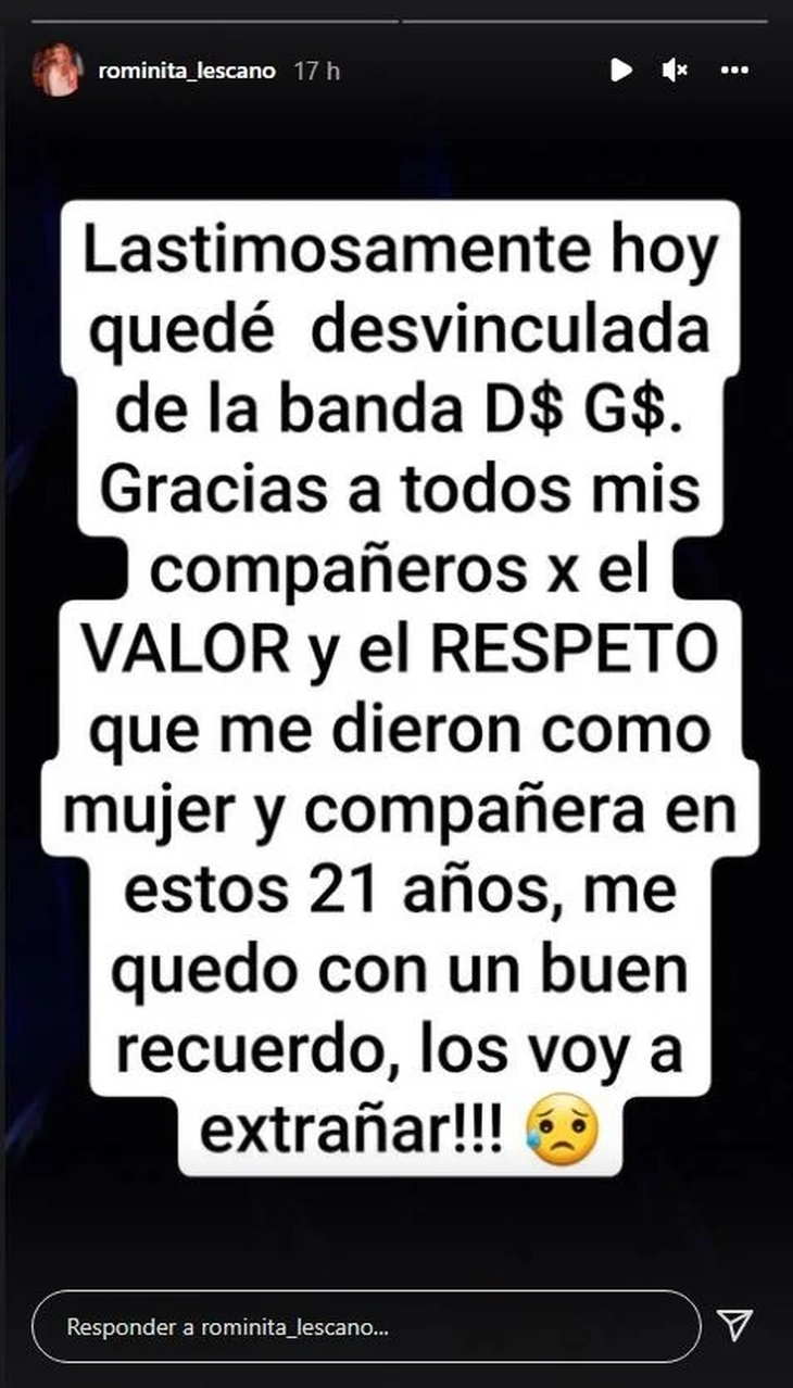 “Lastimosamente hoy quedé desvinculada de la banda Damas Gratis. Gracias a todos mis compañeros por el valor y el respeto que me dieron como mujer y compañera en estos 21 años. Me quedo con un buen recuerdo... ¡los voy a extrañar!”, expresó.