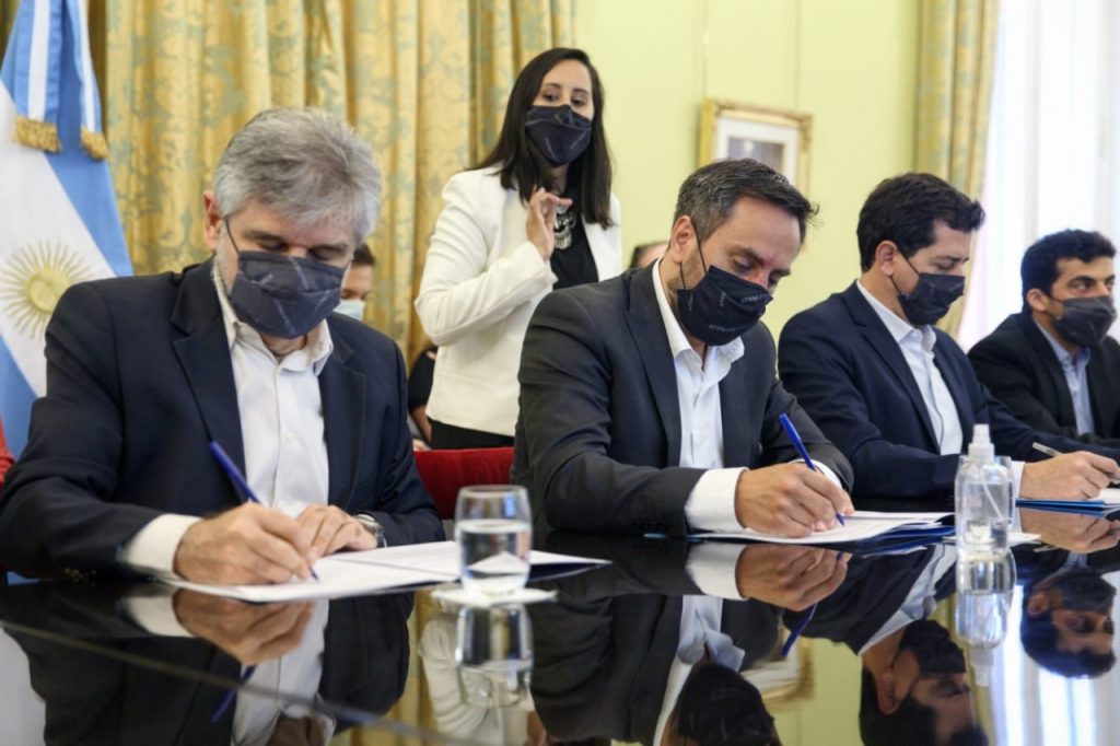 El ministro de Ambiente y Desarrollo Sostenible, Juan Cabandié; su par de Ciencia, Tecnología e Innovación, Daniel Filmus; y el presidente de la Administración de Parques Nacionales, Lautaro Erratchú, en compañía del ministro del Interior, Wado de Pedro, suscribieron esta mañana en Casa de Gobierno un convenio para avanzar en la concreción de centros regionales de investigación en áreas protegidas de las provincias de Chaco, Jujuy, Entre Ríos, Santa Cruz, Río Negro y Tierra del Fuego, Antártida e Islas del Atlántico Sur.