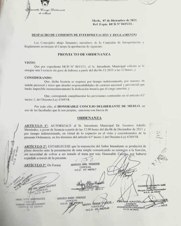 En una sesión ordinaria del Honorable Concejo Deliberante de Merlo se aprobó por mayoría una ordenanza autorizando el pedido del intendente Gustavo Menéndez solicitando licencia sin goce de sueldo por tiempo indeterminado al cargo de intendente del municipio de Merlo.