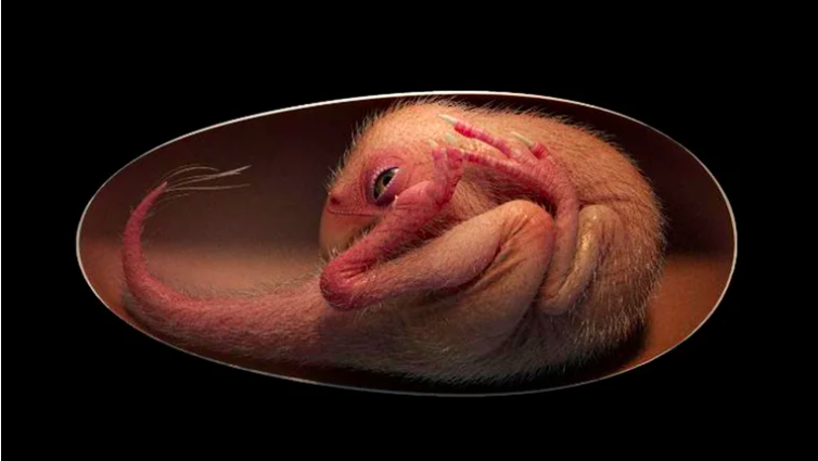 El espécimen “semeja exactamente un polluelo enrollado en su huevo, lo que aporta una prueba adicional que las numerosas características de las aves actuales derivan de sus ancestros dinosaurios”, agregó.