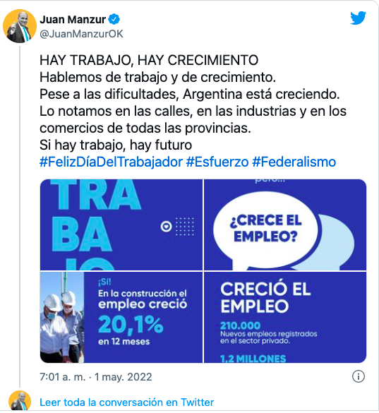 A través de un mensaje de salutación por el Día del Trabajador, el Jefe de Gabinete de la Nación, Juan Manzur, aseguró que "pese a las dificultades, Argentina está creciendo" y "hay trabajo".