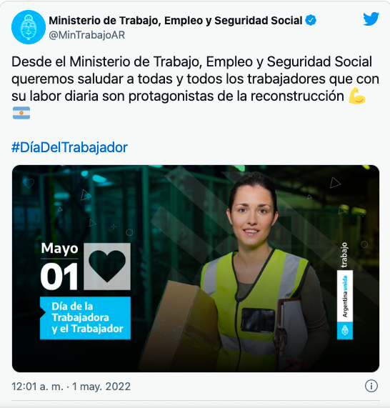 El Ministerio de Trabajo, Empleo y Seguridad Social envió su saludo "a todas y todos los trabajadores que con su labor diaria son protagonistas de la reconstrucción".