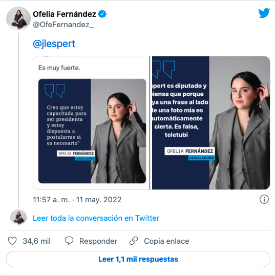 Ante la acidez del diputado por la provincia de Buenos Aires, Fernández redobló la apuesta y le respondió con una nueva falsa declaración suya en una placa. “Espert es diputado y pienso que porque haya una frase al lado de una foto mía es automáticamente cierta. Es falsa, teletubi”, lanzó la legisladora del Frente de Todos.