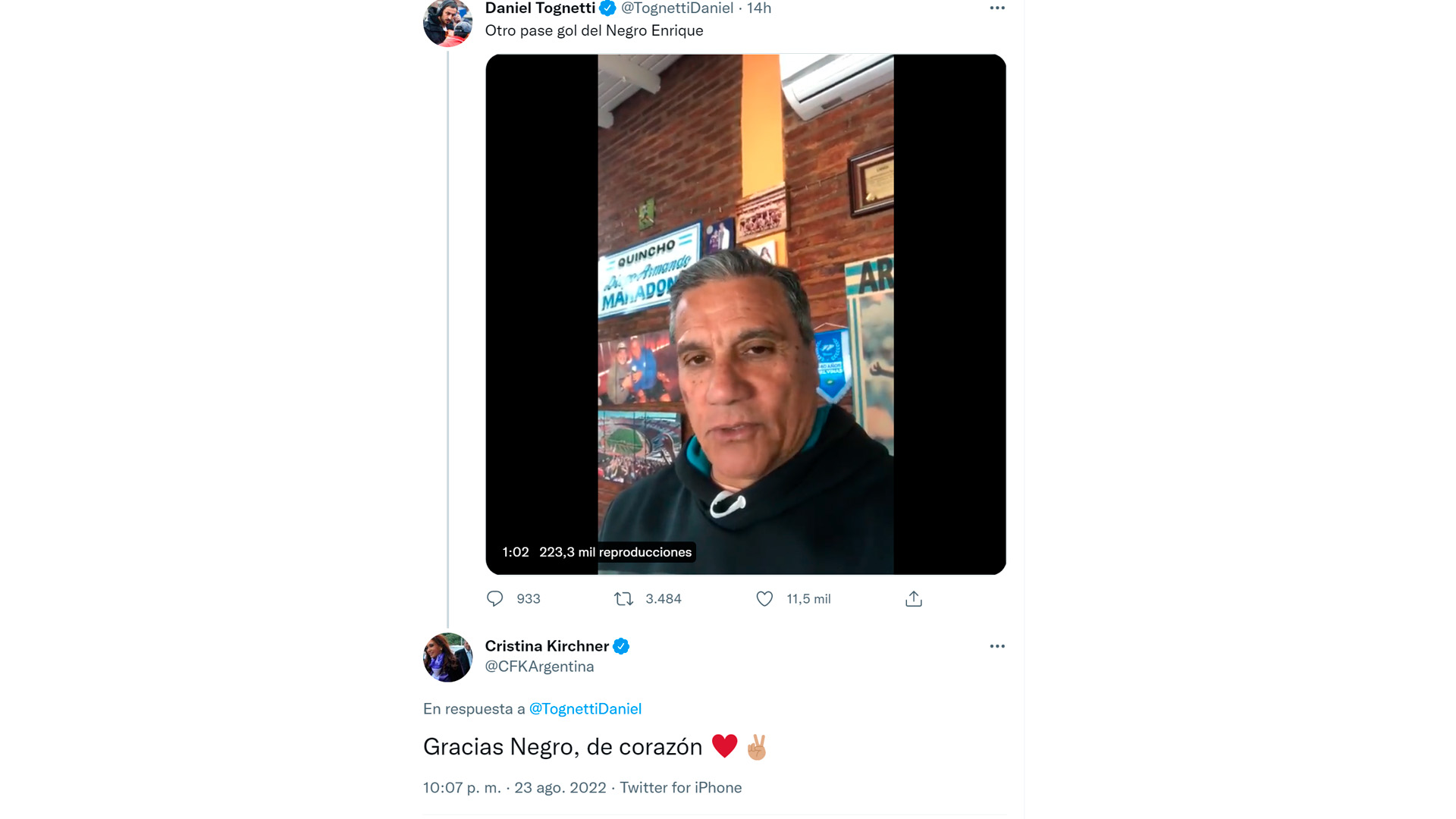 Desde su cuenta oficial de Twitter, la vicepresidente decidió agradecerle al ex futbolista por su defensa pública. “Gracias Negro, de corazón”, escribió Cristina Fernández de Kirchner sobre el perfil del periodista Daniel Tognetti, quien fue uno de los que difundió la filmación.