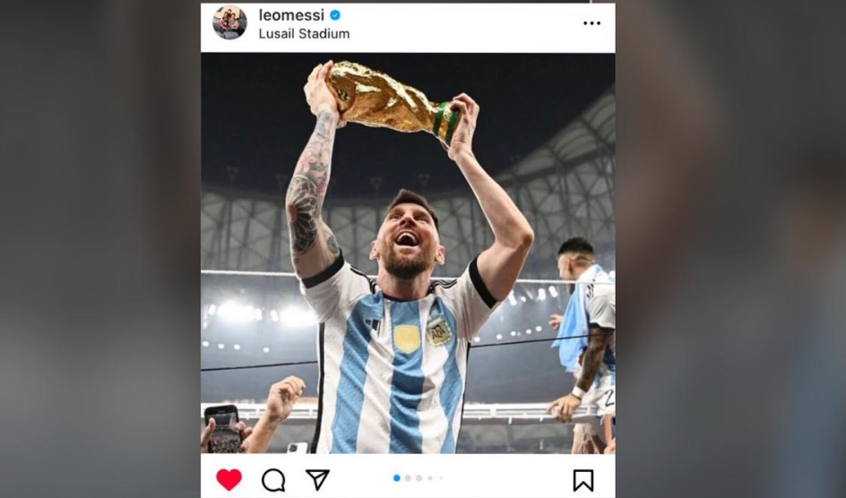 Con más de 58 millones de "likes", la foto de Lionel Messi levantando la Copa del Mundo en el estadio Lusail de Doha se convirtió hoy en la más "likeada" de la historia en la plataforma Instagram, al superar la del "huevo" que cosecha 56.252.978 me gusta en 2019, luego del triunfo de la Selección en el Mundial de Fútbol masculino en Qatar.