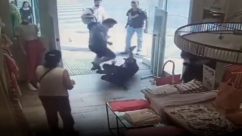 Según quedó registrado en las cámaras de seguridad de ese comercio, el hombre ingresó violentamente al lugar y atacó a una de las policías, la empujó al suelo y comenzó a pegarle patadas.