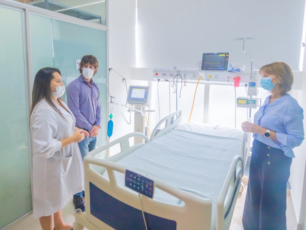 Y la jefa de Internación General del Hospital Viviana Reyes relató al respecto del equipamiento: “Desde hace algún tiempo estamos trabajando en las unidades de internación. Tenemos 93 camas en total, incluyendo las de Terapia Intensiva, Terapia Intermedia y Cuidados Especiales con una máquina para Terapia Dialítica de última tecnología. Ecógrafo para hacer ecografías en la cama del paciente, monitoreo continuo de todas las camas de unidades cerradas, Ventilación Mecánica con ventiladores de última tecnología, radiógrafo portátil y camas específicas Stryker de última tecnología”.