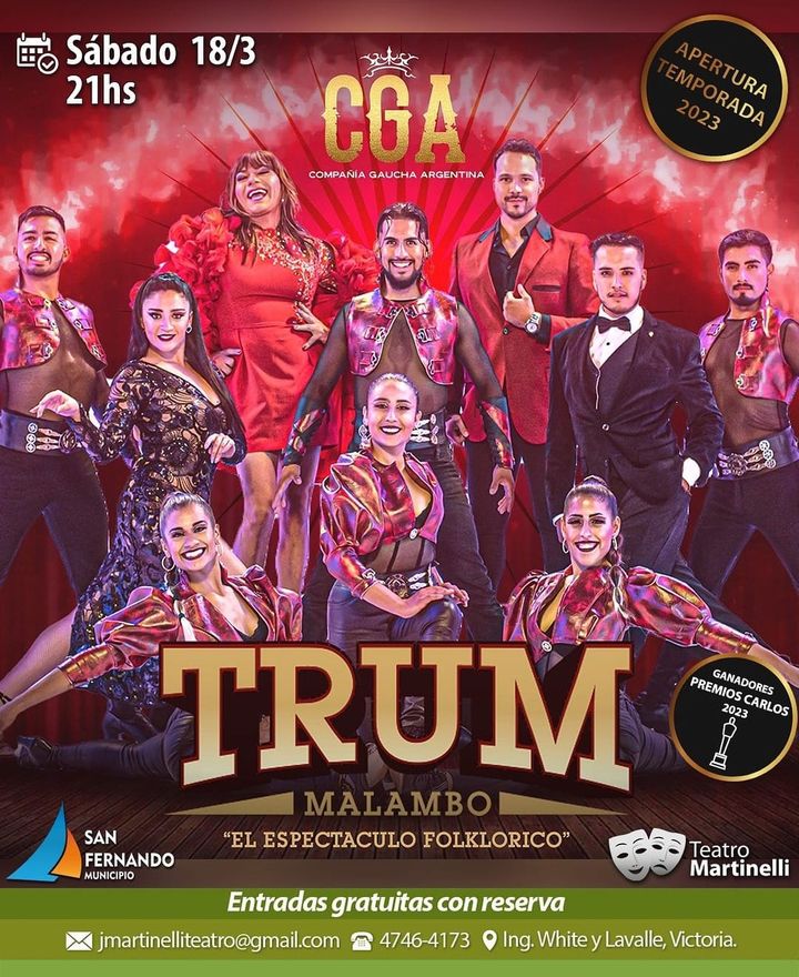 La Temporada teatral 2023 abrirá el sábado 18 de marzo a las 21 horas con “TRUM Malambo. El espectáculo Folklórico” con artistas sanfernandinos reconocidos internacionalmente, que fue galardonado como “Revelación al Mejor Espectáculo de la Temporada“ en Carlos Paz.