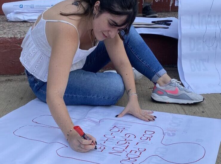 Con el calor de tarde, y luego de dibujar las siluetas que hacen visibles a los compañeros desaparecidos, con la pasión que le pone a todo lo que hace, Juli Ferrari, escribió el nombre de muchos de los compañeros desaparecidos, en la localidad de Olivos, por la siniestra dictadura.