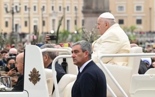 Miles de personas agitaron palmas y ramas de olivo mientras Francisco era conducido a la Plaza de San Pedro sentado...