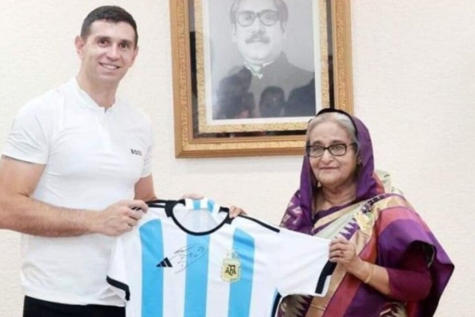 Durante las horas que estuvo en Daca —capital de Bangladesh— Dibu tuvo una agenda intensa. Se entrevistó con Hasina y le regaló una camiseta de la Selección