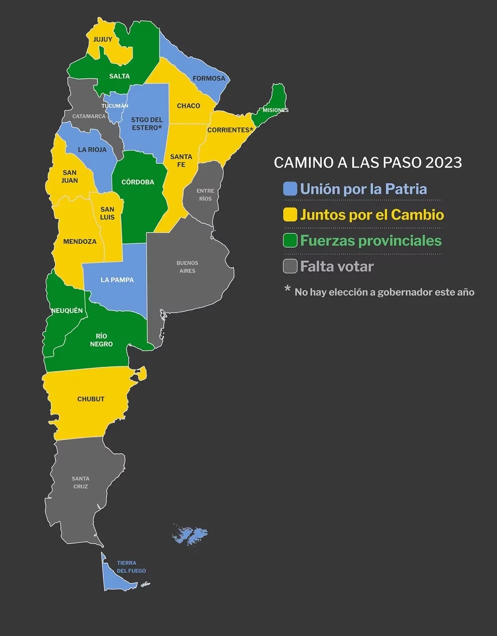 En las 18 elecciones estuvieron habilitados para votar cerca de 17 millones de argentinos, que representan poco menos de la mitad del total del padrón total. En la mayoría se eligieron gobernador, pero en Santa Fe, Mendoza y Chaco hubo PASO y en Corrientes una elección a cargos legislativos locales. Quedaron afuera tres distritos que no fueron a las urnas y que tienen peso decisivo: la provincia de Buenos Aires, la Capital Federal y Entre Ríos. Con menos caudal de votantes, pero también clave, los que viven en Santa Cruz y en Catamarca también votarán por primera vez este año.