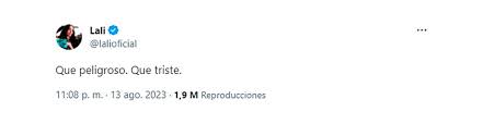 La cantante y actriz Lali Espósito expresó su descontento por el resultado de las elecciones primarias en Argentina, que dieron como ganador al candidato libertario Javier Milei con el 31% de los votos. A través de su cuenta de Twitter, y desde España, la artista pop escribió: "Qué peligroso. Qué triste".