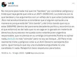 La opinión de Lali Espósito no pasó desapercibida para sus propios seguidores ni para los simpatizantes de Milei, que le respondieron con diversos comentarios. Algunos también la apoyaron y coincidieron con su visión sobre el peligro que representa el candidato libertario para la democracia y los derechos humanos.