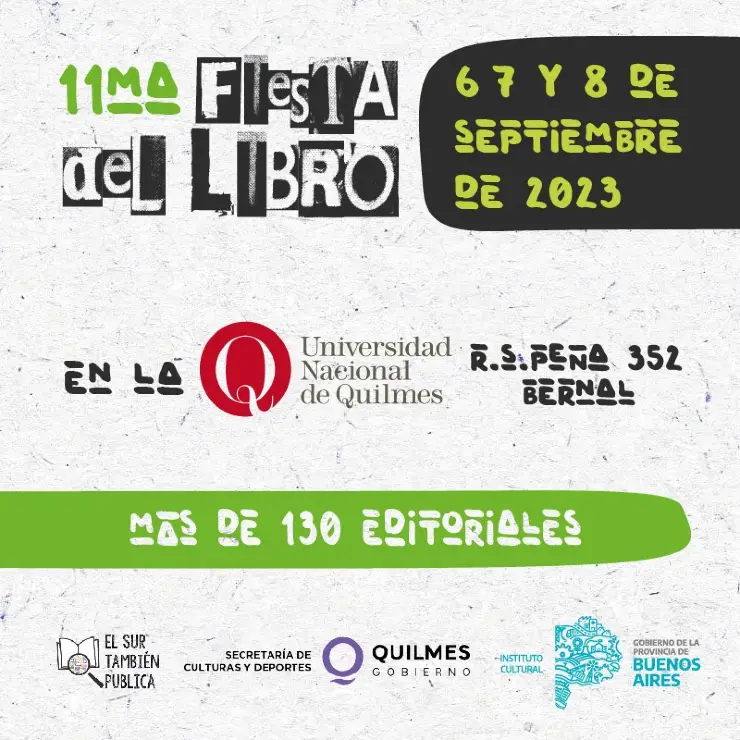 Del 6 al 8 de septiembre se realizará la 11ª edición de la Fiesta del Libro de Quilmes, en el Espacio Madres y Abuelas de Plaza de Mayo de la Universidad Nacional de Quilmes, ubicada en Roque Sáenz Peña 352, en Bernal. Será de 15 a 20.30, los tres días, con entrada libre y gratuita.