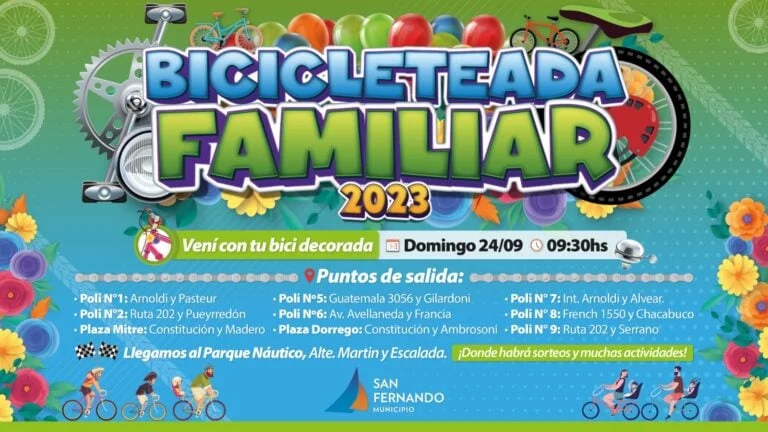 Para celebrar la primavera, el Municipio de San Fernando invita a vecinas y vecinos a sumarse a la gran “Bicicleteada Familiar 2023” que se realizará este domingo 24 de septiembre a las 9.30hs, partiendo desde nueve puntos ubicados estratégicamente en el distrito. La llegada será en el Parque Náutico, en Almirante Martín y Escalada, donde habrá sorteos y diversas actividades. La participación es libre y gratuita.