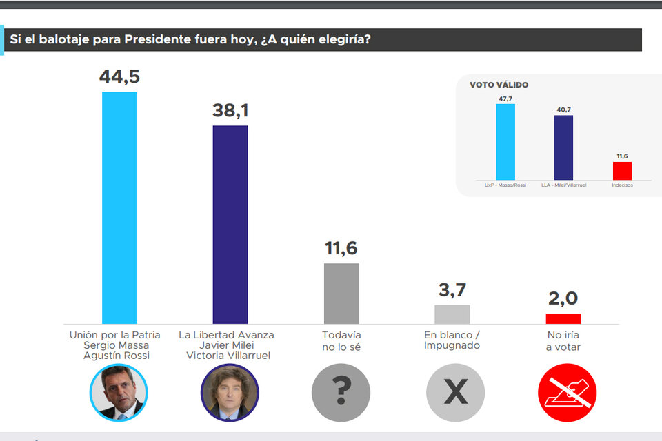 Los que respondieron “todavía no sé” fueron el 11,6 por ciento de los consultados. Aunque el estudio no lo hace, si ese sector votara proporcionalmente como los que ya respondieron por un candidato u otro Massa se acercaría al 50 por ciento contra un 42 por ciento de Milei.