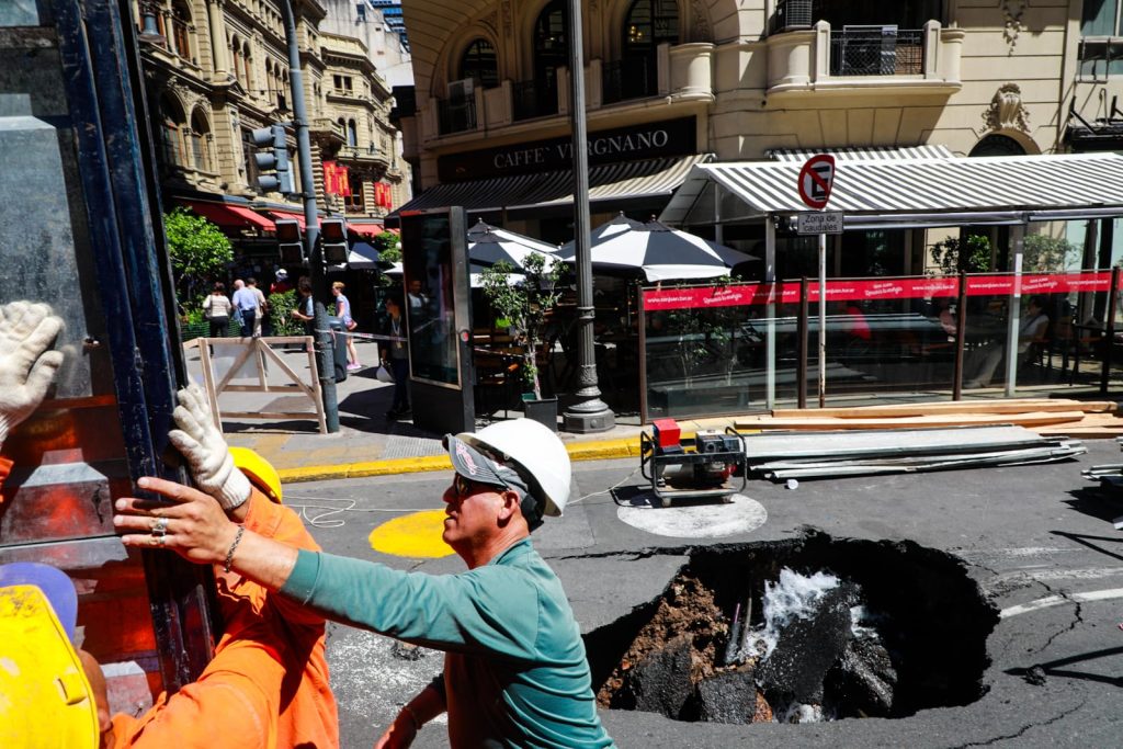AySA se encuentra trabajando en la avenida Cordoba, casi esquina Florida, para detectar y reparar con la mayor celeridad la rotura de una cañería de cloaca que provocó el socavamiento del terreno y posterior hundimiento de la calzada.
