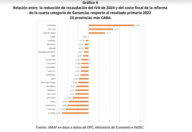 La reducción de los recursos coparticipables por las modificaciones en el Impuesto a las Ganancias y del IVA afectaría a la nación y a las provincias. Según un informe del Instituto Argentino de Análisis Fiscal (IARAF), de acuerdo al Presupuesto 2024 solamente la Ciudad de Buenos Aires y otras cuatro provincias serán superavitarias. En cambio, 19 quedarían en déficit fiscal.