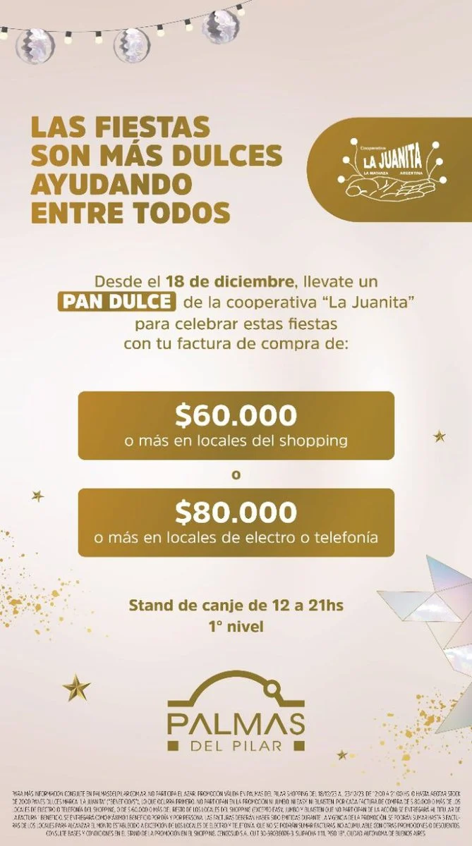 En Portal Escobar, Portal Lomas, Portal Palermo, Palmas del Pilar, Plaza Oeste, Parque Brown, Factory Quilmes y Factory San Martín: con factura de compra, los clientes podrán canjear pan dulce elaborado por Cooperativa “La Juanita”, según lo que se detalla a continuación.
