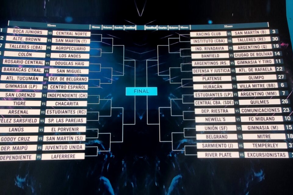 De acuerdo con los emparejamientos que se dieron para la primera fase, Racing irá ante San Martín de Burzaco, Independiente con Laferrere, San Lorenzo con Independiente de Trelew (Chubut), Huracán con Villa Mitre de Bahía Blanca, Estudiantes de la Plata ante Argentino de Monte Maiz )Córdoba), Gimnasia y Esgrima con Centro Español, Rosario Central con Douglas Haig de Pergamino. Newell's Old Boys con Ferrocarril Midland, Unión de Santa Fe con Gimnasia y Esgrima de Mendoza, Belgrano de Córdoba con Mitre de Santiago del Estero, Talleres con Agropecuario de Carlos Casares e Instituto con Talleres de Remedios de Escalada.
