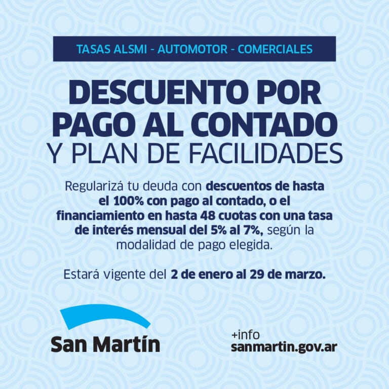 El Municipio de San Martín puso en marcha nuevos planes de pago con descuentos para vecinas, vecinos y empresas que tengan deudas en las tasas ALSMI, Automotor y Comerciales, con el objetivo de facilitar su regularización.