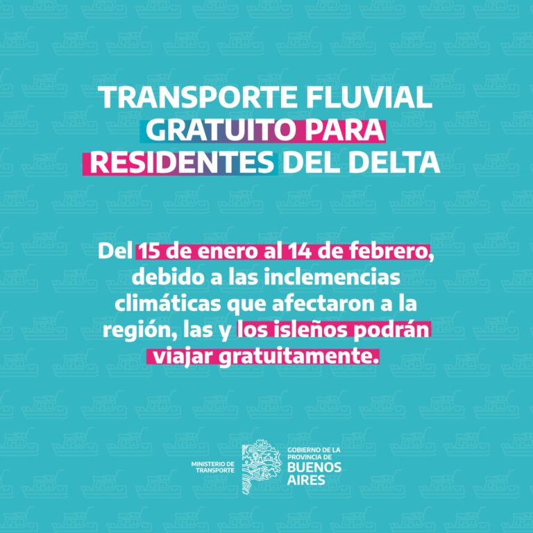 Conforme dicta la resolución, “se establece con carácter excepcional, la gratuidad de los servicios públicos regulares de transporte fluvial de pasajeros, destinados a las personas usuarias residentes en Islas del Delta Bonaerense del Río Paraná, como medida tendiente a alivianar las consecuencias padecidas a raíz del fenómeno climatológico”. La misma entrará en vigencia a las 00 del lunes 15 de enero y hasta las 23.59 del 14 de febrero.