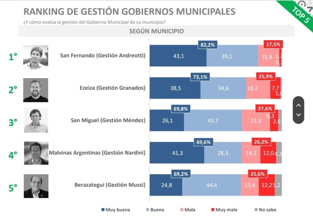 Ee intendente de San Fernando Juan Andreotti fue el mejor valorado en el conurbano bonaerense con un 82,2% de imagen positiva. En el Top 5 se ubican Gastón Granados (Ezeiza) con el 73,1%, Jaime Méndez (San Miguel) con el 69,8%, Leonardo Nardini (Malvinas Argentinas) con el 69,6% y Juan José Mussi (Berazategui) con el 69,2%.