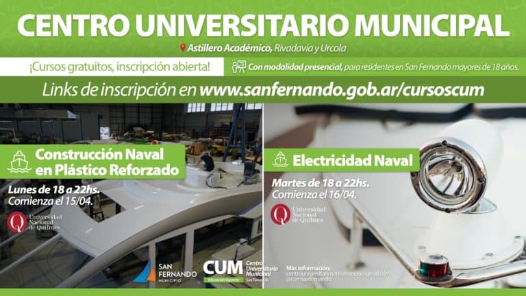 Se abrieron inscripciones para capacitaciones gratuitas de la Universidad Nacional de Quilmes, de modalidad presencial y con grandes posibilidades de salida laboral: Construcción Naval en Plástico Reforzado y Electricidad Naval. Ambos se dictarán en el ‘Astillero Académico Municipal’ (Rivadavia y Urcola, San Fernando), perteneciente al Centro Universitario Municipal. Link de inscripción en la página web www.sanfernando.gob.ar/cursoscum.