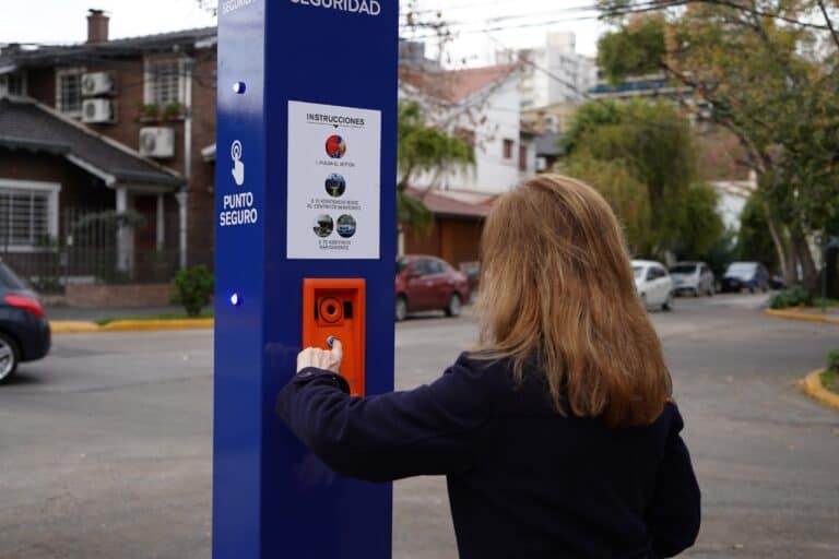 En todo el territorio de Vicente López están instalados tótems color azul y verde que poseen un botón antipánico para asistir al vecino de manera inmediata ante cualquier emergencia, se trata de los Puntos Seguros.