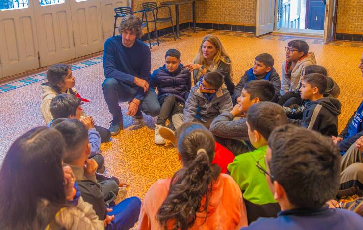 El intendente Juan Andreotti conversó en el edificio histórico restaurado con los chicos que asisten a los CEIM, institución que refuerza la enseñanza en el horario opuesto a sus escuelas primarias. Las visitas guiadas por dependencias emblemáticas integran su programa educativo.