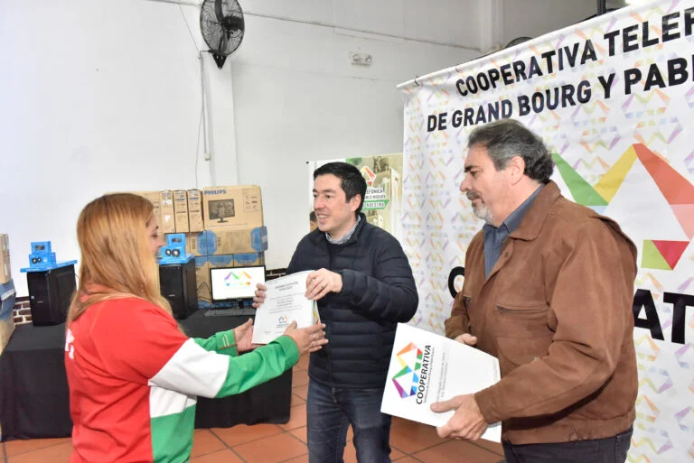 Instituciones intermedias que cumplen un rol social en el distrito, recibieron kits tecnológicos por parte de la Cooperativa Telefónica de Grand Bourg y Pablo Nogués.
