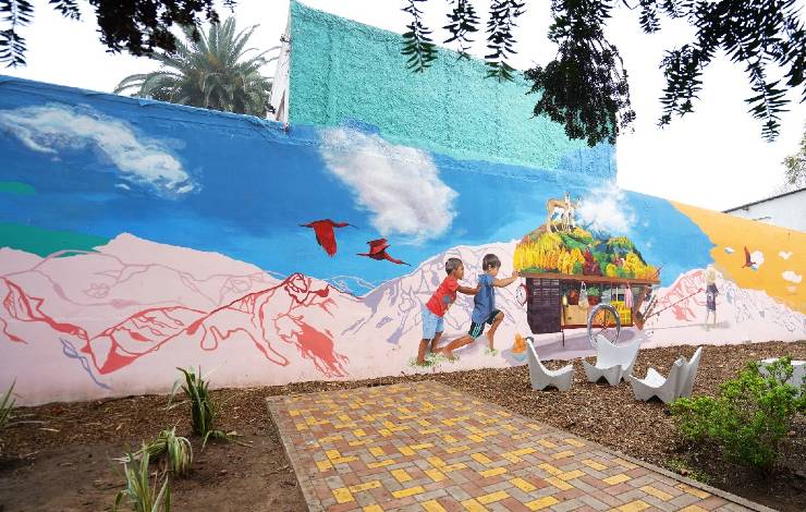 En el marco del programa de intervenciones urbanas “Viví Arte”, se finalizó un nuevo mural en la plaza Josefina C. de Bignone ubicada en Vicente López.Se trata de una obra de Mabel Vicentef titulada “Escapada”. Esta refleja a niños que esculpen un universo fantástico en una carreta, hay montañas que danzan con su ingenio, creando un viaje visual donde la realidad y la fantasía convergen.