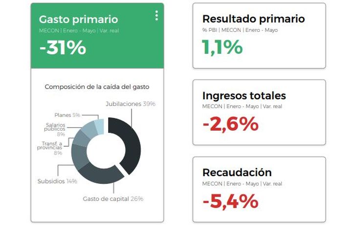 Respecto al primer semestre de Milei ponderan positivamente la consolidación del déficit fiscal cero con los mejores números en 16 años. "Desde 2008 no se alcanzan 5 meses consecutivos de superávit financiero", señalan y agregan además que el gobierno lleva adelante "el mayor recorte del gasto en términos reales en 30 años". El relevamiento es acompañado por un gráfico que ubica a las jubilaciones como el principal recorte.