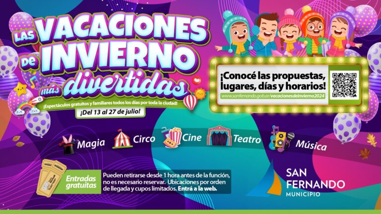 El Municipio planificó entre el 13 y el 27 de julio un circuito de espectáculos de Vacaciones de Invierno gratuitos para toda la familia. La programación puede consultarse en la web www.sanfernando.gob.ar/vacacionesdeinvierno2024