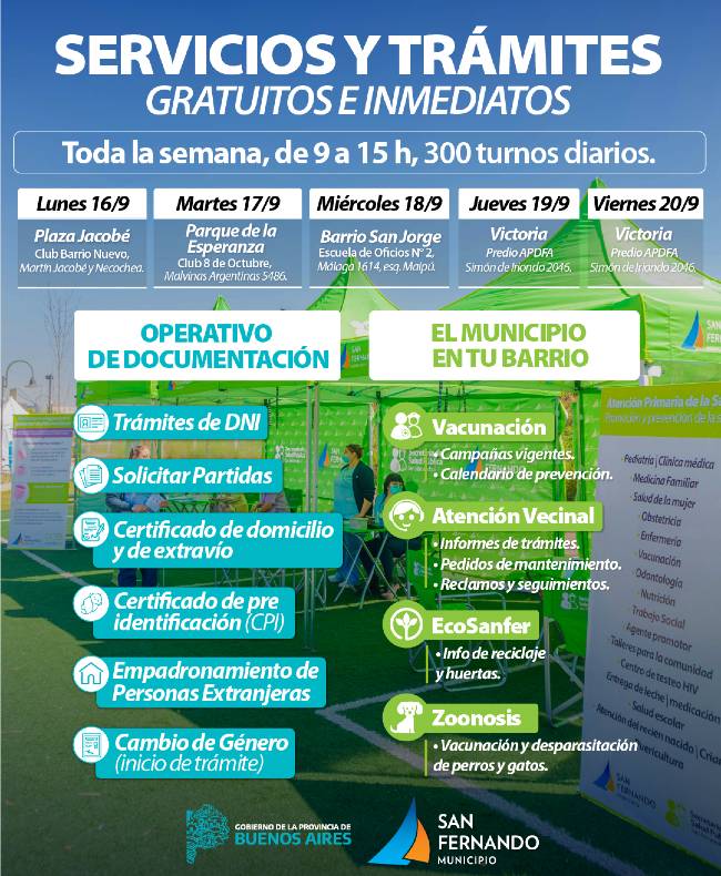 En varios puntos de San Fernando se realizarán el operativo “El Municipio en tu Barrio”, y un operativo de Documentación junto a la Provincia de Buenos Aires del lunes 16 al viernes 20 de septiembre de 9 a 15h. Se otorgarán 300 turnos por día para Documentación; además, la totalidad de los servicios son gratuitos.
