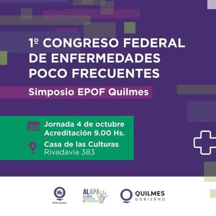 El Municipio de Quilmes informa que el viernes 4 de octubre se llevará adelante en la Casa de las Culturas, ubicada en Rivadavia 383, una de las jornadas del 1º Congreso Federal de Enfermedades Poco Frecuentes (EPOF), dirigido a profesionales de la salud de las distintas áreas, promotores, estudiantes, referentes de organizaciones y áreas municipales.