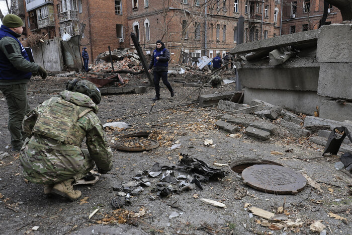 Kharkiv (Ukraine), 25/11/2024.- Ukrainian experts inspect debris at the site of a missile strike that hit central Kharkiv, northeastern Ukraine, 25 November 2024, amid the Russian invasion. At least 23 people were injured as a result of a missile strike that hit Kharkiv on 25 November morning, the State Emergency Service of Ukraine (SESU) reported. Russian troops launched 145 'shock' drones across Ukraine overnight and several ballistic missiles to Odesa and Kharkiv in the morning, according to the Air Force Command of Ukraine. Russian troops entered Ukrainian territory on 24 February 2022, starting a conflict that has provoked destruction and a humanitarian crisis. (Rusia, Ucrania) EFE/EPA/SERGEY KOZLOV