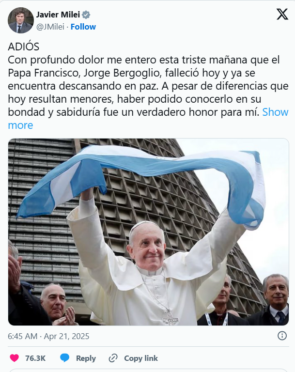 El presidente Javier Milei se expresó a través de su cuenta de X tras el fallecimiento del papa Francisco, con quien mantuvo una tensa relación desde que asumió. "A pesar de diferencias que hoy resultan menores, haber podido conocerlo en su bondad y sabiduría fue un verdadero honor para mí", escribió el mandatario. El Gobierno decretará siete días de duelo.