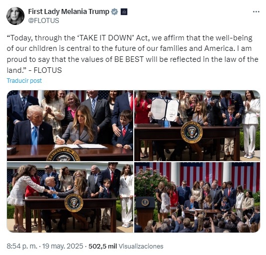 "Esta legislación es un paso decisivo en nuestros esfuerzos por garantizar que todos los estadounidenses, especialmente los jóvenes, puedan sentirse mejor protegidos contra ataques a su imagen o identidad a través de imágenes no consensuadas", sostuvo Melania Trump, durante una aparición pública junto a su marido.