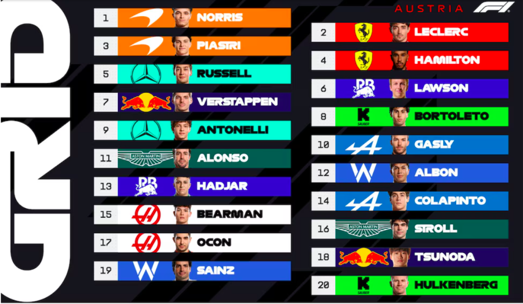 El Gran Premio de Austria tendrá a Lando Norris largando desde la pole position por delante de Charles Leclerc y Oscar Piastri, segundo y tercero, respectivamente.
