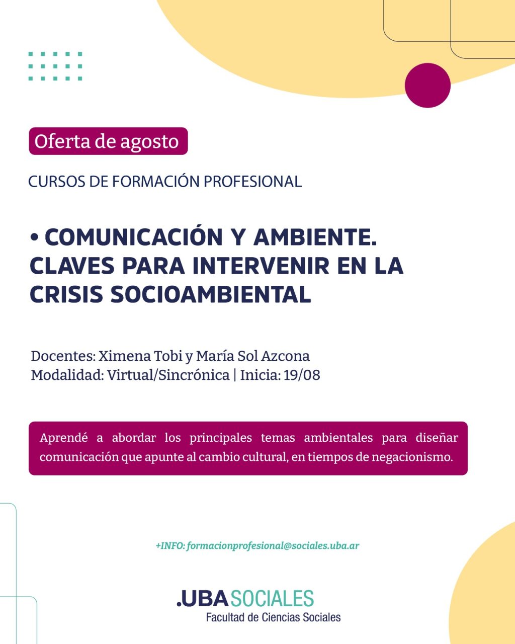 El nuevo Curso de la UBA que inicia en Agosto. Es 100% virtual y dura dos meses. Inscripciones