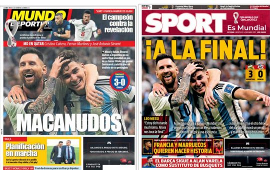 Mundo Deportivo titula "Macanudos", con la foto del abrazo entre Messi y Álvarez y agrega: "Messi y Julián Álvarez meten...